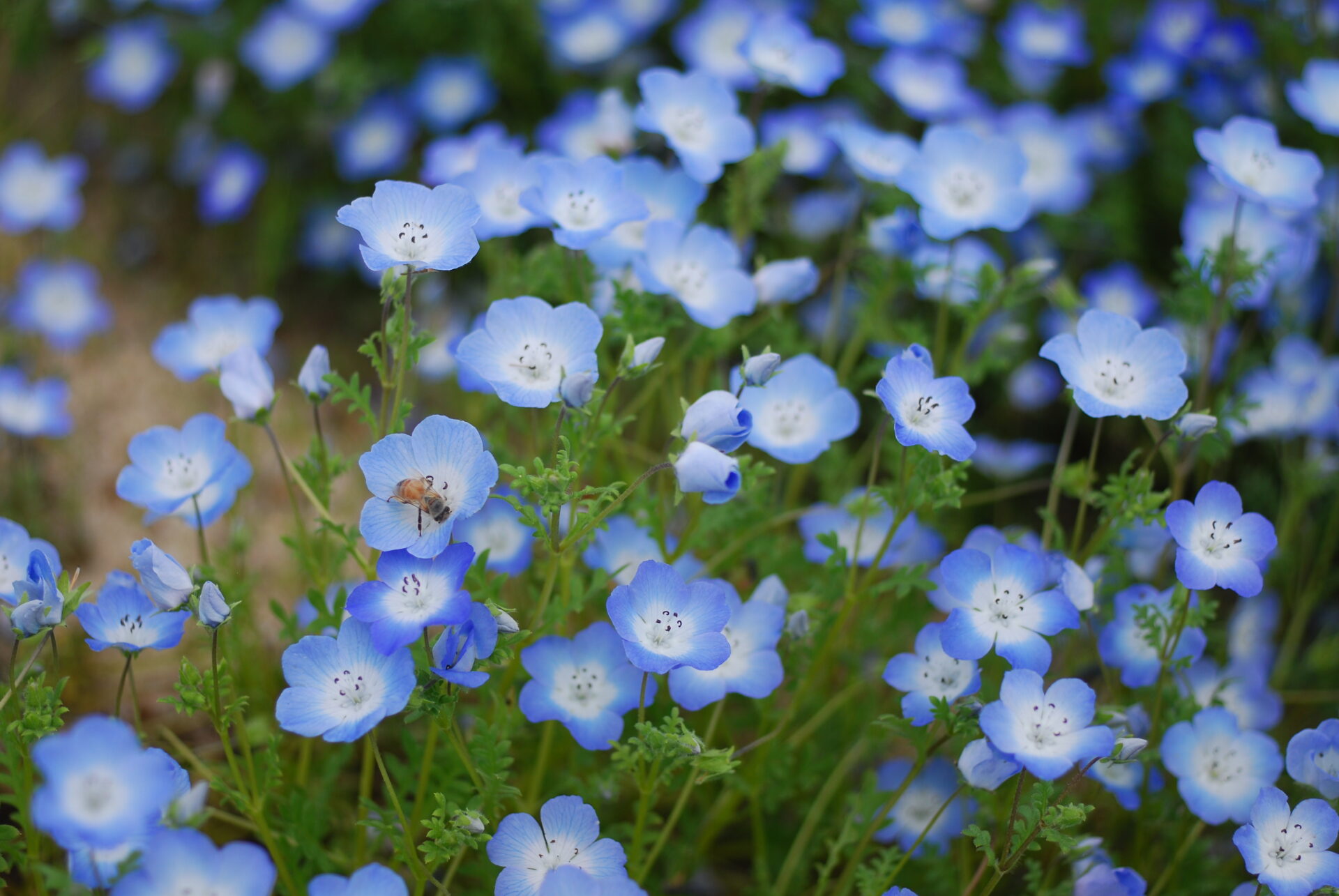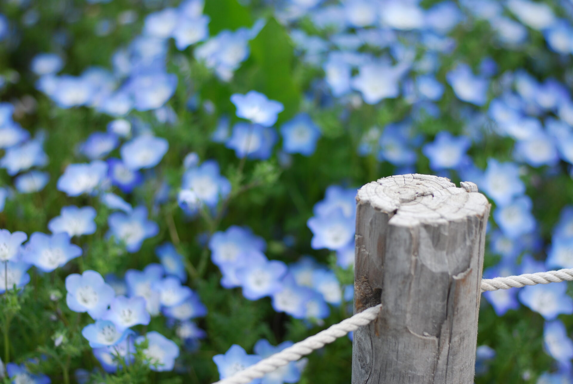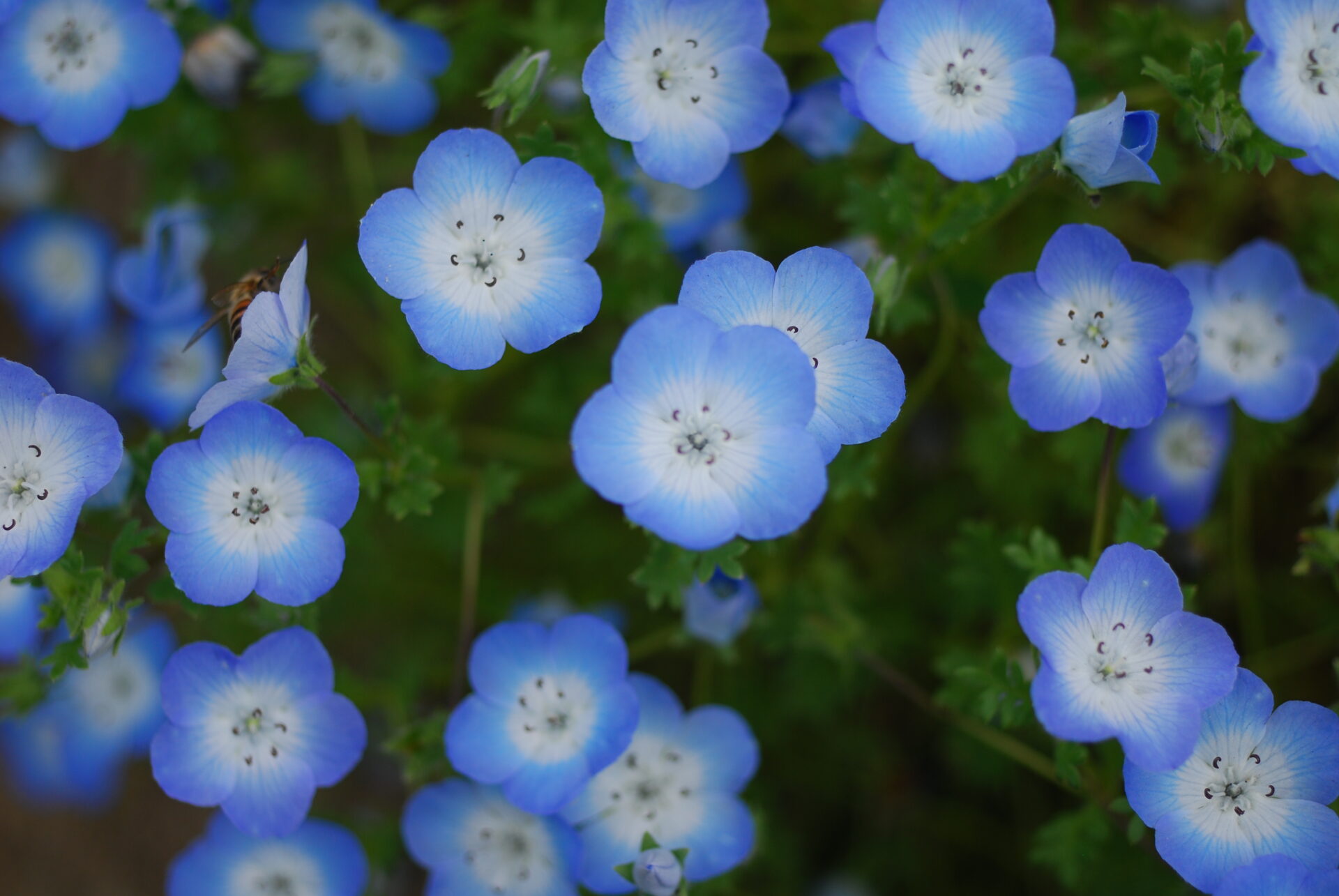 目的はネモフィラ。淡い青色が特徴の小さな花の群生を撮りに行った。カメラはNikon D40XとAi Micro-Nikkor 55mm。APS-Cだから約80mm相当のやや望遠だが、花を撮るなら寄れるレンズの方が楽しい。AFもライブビューも無いため山勘でMF撮影した。