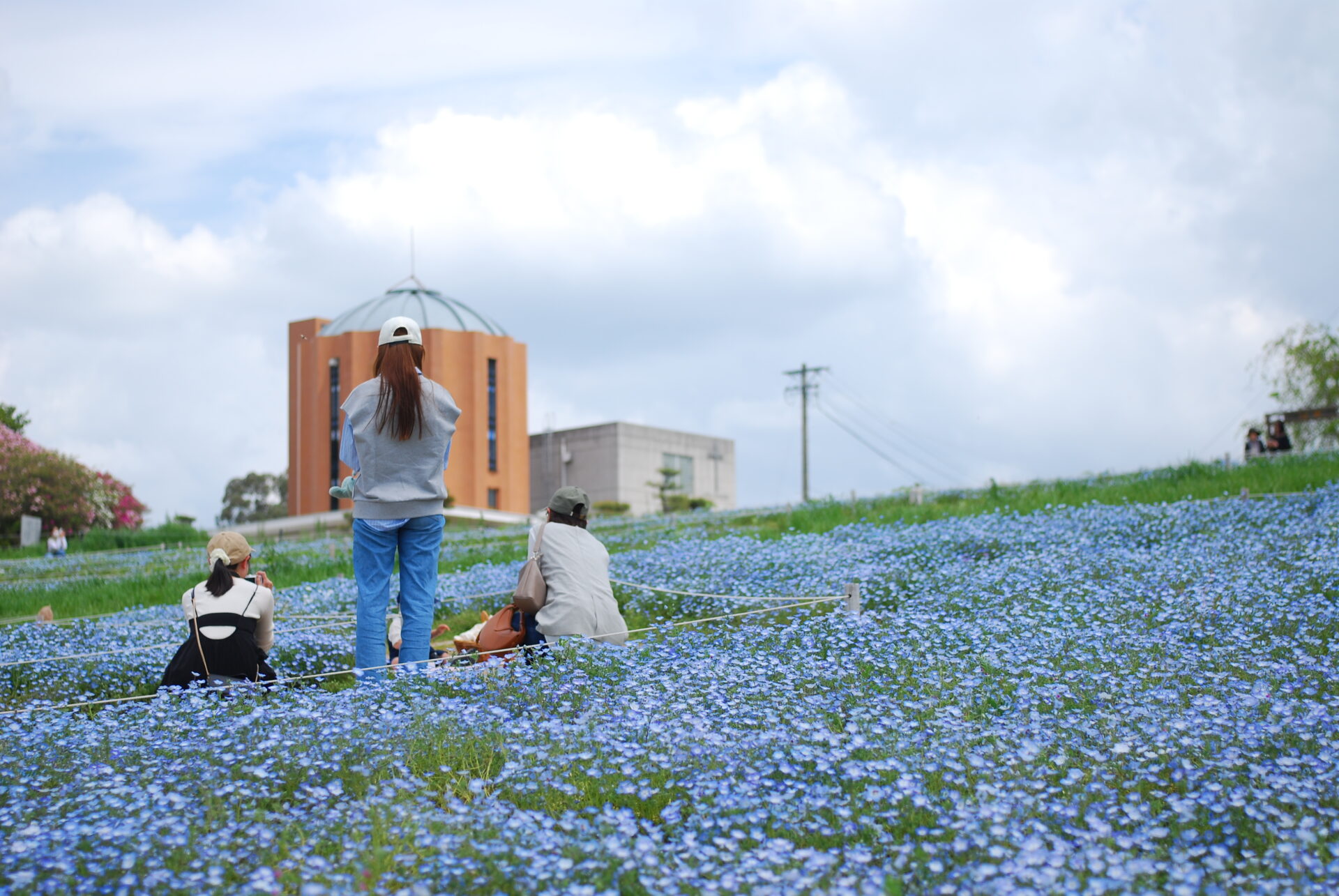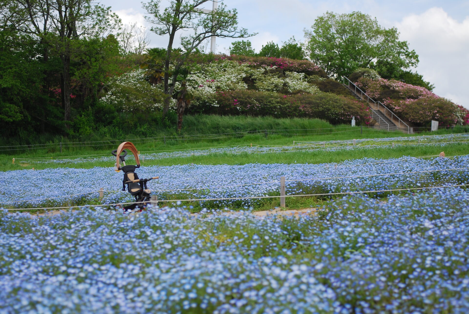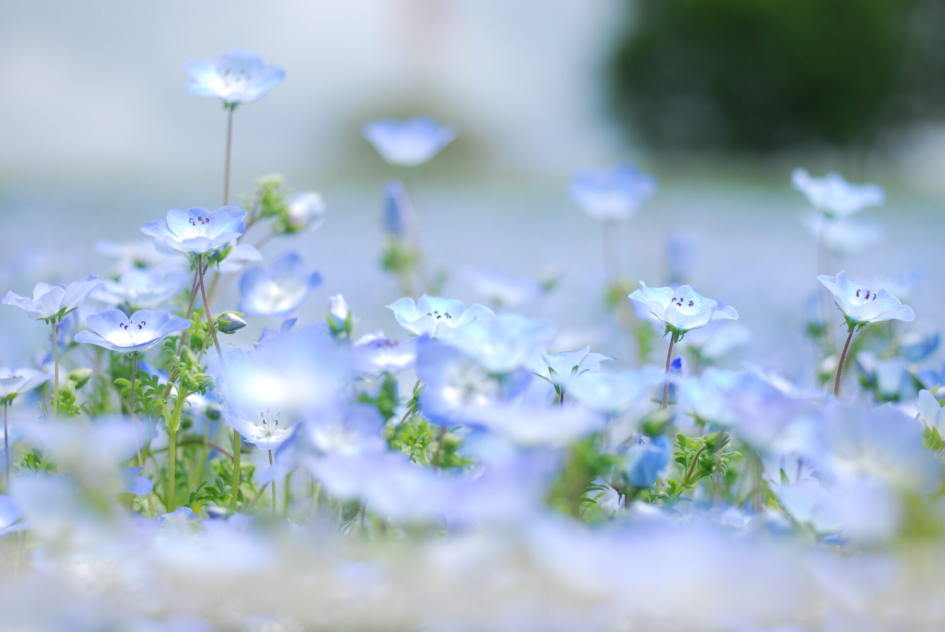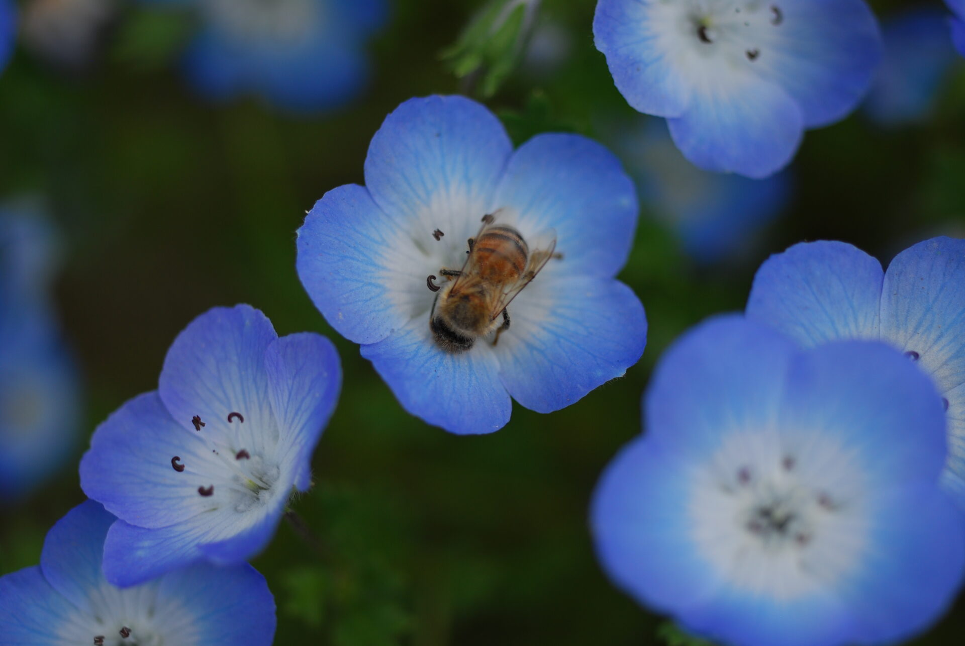 目的はネモフィラ。淡い青色が特徴の小さな花の群生を撮りに行った。カメラはNikon D40XとAi Micro-Nikkor 55mm。APS-Cだから約80mm相当のやや望遠だが、花を撮るなら寄れるレンズの方が楽しい。AFもライブビューも無いため山勘でMF撮影した。